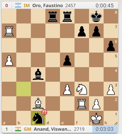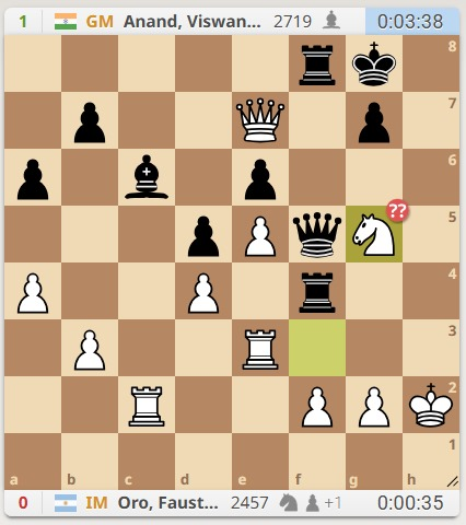 Anand Viswanathan (2719) – Oro Faustino (2457) 1. e4 e5 2. Nf3 Nc6 3. Bb5 a6 4. Ba4 Nf6 5. d3 b5 6. Bb3 Bc5 7. c3 d6 8. O-O Bb6 9. Nbd2 O-O 10. Re1 Ne7 11. d4 Ng6 12. h3 Bb7 13. Bc2 Re8 14. a4 Qd7 15. b3 Rad8 16. d5 Nh5 17. Nf1 Bc8 18. Be3 Bxe3 19. fxe3 c6 20. c4 b4 21. N3h2 Nf6 22. Ng3 h6 23. Rf1 Nh7 24. Nf5 Ne7 25. Nxe7+ Qxe7 26. dxc6 Qc7 27. a5 Qxc6 28. Qd2 Qc5 29. Nf3 Bb7 30. Ne1 Qa7 31. Ra4 Ng5 32. Rxb4 Nxe4 33. Qd3 Ba8 34. Rb6 d5 35. cxd5 Bxd5 36. Qxa6 Qxa6 37. Rxa6 Nd2 38. Rf2 Nxb3 39. Nf3 Bc4 40. Ra7 Nc1?? (40…Ra8 holds)