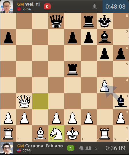 Fabiano Caruana (2795) – Wei Yi (2754) 1. Nf3 Nf6 2. c4 c5 3. g3 g6 4. Nc3 d5 5. cxd5 Nxd5 6. Bg2 Bg7 7. Qa4+ Nc6 8. Ng5 Nb6 9. Bxc6+ bxc6 10. Qxc6+ Bd7 11. Qxc5 h6 12. Nf3 Rc8 13. Qa5 Bh3 14. Qb5+ Nd7 15. Rg1 O-O 16. g4 Rc5 17. Qb3 Ne5 18. Nxe5 Rxe5