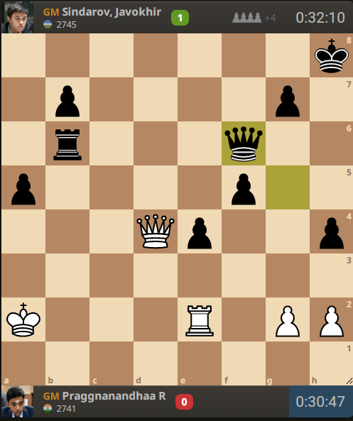 Praggnanandhaa Rameshbabu (2741) – Javokhir Sindarov (2745) 1. d4 d5 2. c4 e6 3. Nc3 Be7 4. Nf3 Nf6 5. Bf4 O-O 6. e3 c5 7. dxc5 Bxc5 8. a3 Nc6 9. Qc2 Re8 10. Bg5 d4 11. Bxf6 Qxf6 12. Ne4 Qf5 13. b4 Nxb4 14. axb4 Bxb4+ 15. Kd1 dxe3 16. Bd3 Qg6 17. fxe3 f5 18. Ng3 Bc5 19. Qc3 e5 20. Bc2 e4 21. Nd2 Rd8 22. Kc1 Qg5 23. Re1 Qe7 24. Re2 Bb4 25. Qb2 a5 26. Nb3 Ra6 27. Nd4 Qg5 28. Kb1 h5 29. Ka2 h4 30. Nf1 Bd7 31. Rd1 Rc8 32. Nd2 Rb6 33. c5 Rxc5 34. Qb3+ Kh8 35. Qf7 Rxc2+ 36. Kb1 Rxd2 37. Rdxd2 Bxd2+ 38. Ka2 Bxe3 39. Qxd7 Bxd4 40. Qxd4