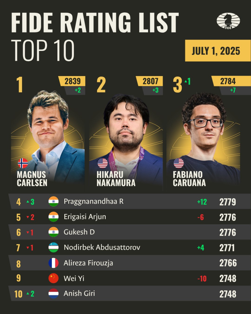 July 1st brings a new official update to the FIDE rating list, published every month. The biggest highlight is Praggnanandhaa’s gains becoming formalized, as his rating refreshes to 2779 and he reaches a new peak rank of number four in the world. That means he leads countrymen Arjun Erigaisi and World Champion Gukesh, while only trailing the iconic trio of Carlsen, Nakamura, and Caruana.