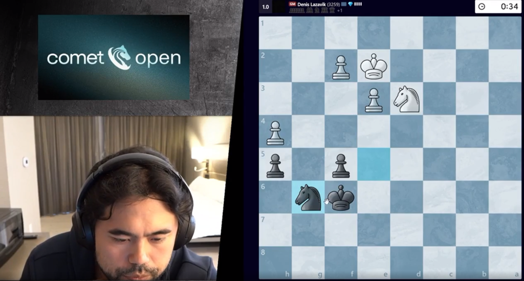 On October 12, Nakamura played an uneventful draw against 2366-rated IM Mike Ivanov at the 2025 Maritime Open, a classical tournament, to free up his schedule for the Comet Open’s online qualifier, a two-hour blitz arena held on chess.com. Read more about Nakamura’s successful juggling act [here]. He went on to win the sixth qualifier arena, earning his spot in the 32-player knockout stage held from October 18 to 19.