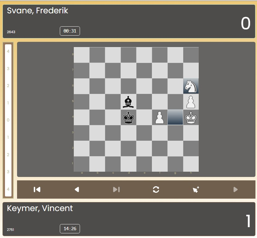 Keymer Vincent (2751) – Svane Frederik (2643) 1. e4 e5 2. Nf3 Nc6 3. Bb5 a6 4. Ba4 Nf6 5. O-O Nxe4 6. d4 b5 7. Bb3 d5 8. dxe5 Be6 9. c3 Bc5 10. Nbd2 O-O 11. Bc2 Nxf2 12. Rxf2 f6 13. exf6 Qxf6 14. Qf1 Rae8 15. Nb3 Bxf2+ 16. Qxf2 Ne5 17. Nbd4 Bg4 18. Bg5 Qb6 19. Qh4 Nxf3+ 20. gxf3 Bf5 21. Bb3 c6 22. Be7 Rf7 23. Re1 Bd7 24. Re5 c5 25. Bxc5 Qxc5 26. Rxd5 Qc7 27. Qh5 Ree7 28. Rc5 Qd6 29. Bxf7+ Rxf7 30. Rd5 Qf8 31. a3 h6 32. Qg6 Qe8 33. Qd3 Qe1+ 34. Qf1 Qe3+ 35. Qf2 Qc1+ 36. Kg2 Re7 37. h4 Qf4 38. Ne2 Qf6 39. Rd4 Qg6+ 40. Ng3 Bc6 41. Rd8+ Re8 42. Rxe8+ Qxe8 43. Qc5 Qe6 44. Kf2 Qf6 45. Qh5 Qf4 46. Qg4 Qd2+ 47. Ne2 Be8 48. Qc8 Kf7 49. Qxa6 Qxb2 50. Qb7+ Kf8 51. a4 b4 52. Qxb4+ Qxb4 53. cxb4 Bxa4 54. Nd4 Bd7 55. b5 Ke7 56. h5 Kd6 57. Ke3 Kc5 58. Ke4 Kb6 59. Nf5 Bxb5 60. Ke5 Be2 61. Kf4 Bb5 62. Nxg7 Bc6 63. Nf5 Be8 64. Ng3 Bc6 65. Ne4 Be8 66. Kg4 Bd7+ 67. Kg3 Be8 68. Nf6 Bf7 69. Kh4 Kc5 70. Ng4 Bd5 71. f4 Kd4
