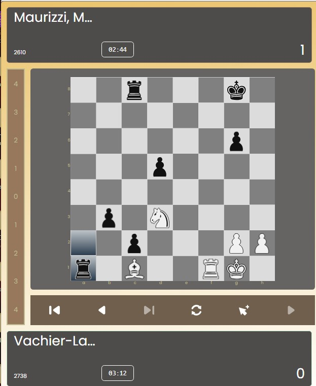 Vachier-Lagrave Maxime (2738) – Maurizzi MarcAndria (2610) 1. e4 c6 2. d4 d5 3. e5 Bf5 4. Nf3 e6 5. Be2 Ne7 6. O-O c5 7. Be3 Nec6 8. c3 Nd7 9. a3 Be7 10. b4 cxd4 11. cxd4 O-O 12. Nbd2 Rc8 13. Rc1 a6 14. Nb3 b5 15. Nc5 Nb6 16. Nxa6 Nc4 17. a4 Nxb4 18. Nxb4 Bxb4 19. Qb3 Ba3 20. Rxc4 dxc4 21. Qxa3 Qa5 22. d5 b4 23. Qb2 exd5 24. Nd4 Bd7 25. f4 c3 26. Qb1 Bxa4 27. Bd3 g6 28. f5 b3 29. Qe1 Qc7 30. Bh6 c2 31. Qb4 Qxe5 32. Qxa4 Rc4 33. Nc6 Rxa4 34. Nxe5 Rc8 35. Bc1 Ra2 36. fxg6 hxg6 37. Bxg6 fxg6 38. Nd3