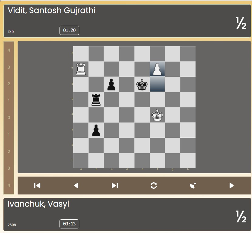 Ivanchuk Vasyl (2608) – Vidit Santosh Gujrathi (2712) 1. e4 e5 2. Nf3 Nc6 3. d4 exd4 4. Nxd4 Nf6 5. Nxc6 bxc6 6. e5 Qe7 7. Qe2 Nd5 8. h4 Qe6 9. Nd2 a5 10. c4 Nb4 11. Nf3 Qg6 12. h5 Qc2 13. h6 gxh6 14. Nd4 Qxe2+ 15. Kxe2 Bg7 16. Rh4 Ba6 17. Ke1 c5 18. a3 cxd4 19. axb4 axb4 20. Bxh6 Bxh6 21. Rxh6 Bb7 22. Rxa8+ Bxa8 23. g3 Ke7 24. Kd2 Rg8 25. Ra6 Bf3 26. Rf6 Bh5 27. Rh6 Bg6 28. Bh3 Ra8 29. f4 Be4 30. f5 Ra5 31. Rxh7 Rxe5 32. g4 Ra5 33. Bf1 Ra2 34. Bd3 Bxd3 35. Kxd3 Rxb2 36. Kxd4 Rg2 37. Ke5 Rxg4 38. f6+ Kf8 39. Rh8+ Rg8 40. Rh1 Ke8 41. c5 d6+ 42. cxd6 c6 43. Ra1 Rg5+ 44. Kf4 Rb5 45. Ra8+ Kd7 46. Rf8 Kxd6 47. Rxf7 b3 48. Ra7 Ke6 49. f7 Rb8 50. Ke3 b2 51. f8=Q Rxf8 52. Rb7 Kd5 53. Rxb2 c5 54. Rc2 Rh8 55. Rc1 Rh2 56. Kd3 Rh3+ 57. Kc2 Kc4 58. Rg1 Rh2+ 59. Kc1 Re2 60. Rg3 Kb4 61. Rh3 c4 62. Rg3 Rh2 63. Rf3 Ra2 64. Rh3 Rg2 65. Rf3 c3 66. Rf7 Rb2 67. Rb7+ Ka3