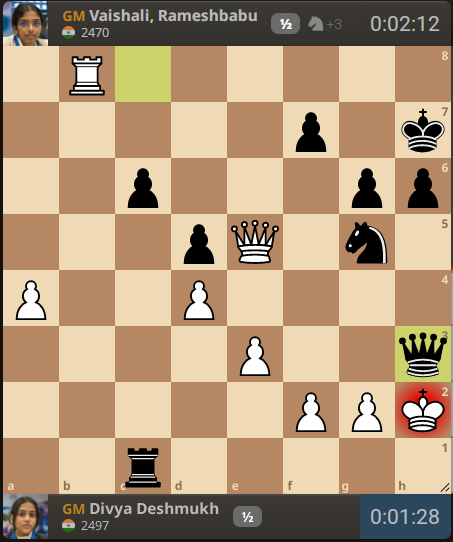 Divya Deshmukh (2497) – Vaishali Rameshbabu (2470) 1. c4 e6 2. Nc3 d5 3. d4 h6 4. cxd5 exd5 5. Bf4 c6 6. e3 Bd6 7. Bxd6 Qxd6 8. Bd3 Ne7 9. Qc2 O-O 10. Nf3 Nd7 11. O-O Nf6 12. h3 g6 13. Rab1 a5 14. Na4 Bf5 15. Nc5 Qc7 16. Rfc1 Nd7 17. Na4 Rfe8 18. Nc3 Qd6 19. Ne2 Qf6 20. Nf4 Bxd3 21. Nxd3 Nf5 22. b4 Nd6 23. a4 Qe7 24. bxa5 Rxa5 25. Rb4 Rea8 26. Rcb1 R8a7 27. Qb3 Qd8 28. Nfe5 Kg7 29. Qd1 Qe7 30. Qb3 Qd8 31. Qd1 Qe7 32. Nxd7 Qxd7 33. Nc5 Qc8 34. Qf3 Ne4 35. Rxb7 Rxb7 36. Rxb7 Ng5 37. Qg3 Rxc5 38. Qe5+ Kh7 39. Rb8 Rc1+ 40. Kh2