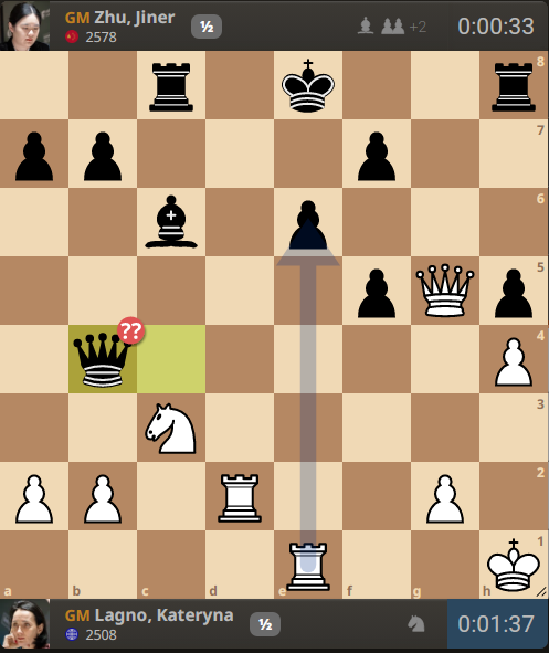 Kateryna Lagno (2509) – Zhu Jiner (2578) 1. e4 e6 2. d4 d5 3. Nd2 c5 4. Ngf3 cxd4 5. exd5 Qxd5 6. Bc4 Qd6 7. Ne4 Qb4+ 8. Nfd2 Nf6 9. Nxf6+ gxf6 10. O-O Nc6 11. Re1 Bd7 12. c3 Qb6 13. cxd4 Qxd4 14. Ne4 Be7 15. Qe2 f5 16. Nc3 Qg4 17. f3 Qg7 18. Bf4 Nd4 19. Qf2 Nxf3+ 20. Qxf3 Qd4+ 21. Kh1 Qxc4 22. Qg3 Bc6 23. Rad1 Bf6 24. h3 h5 25. h4 Rd8 26. Bg5 Bxg5 27. Qxg5 Rc8 28. Rd2
