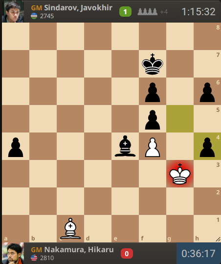 Hikaru Nakamura (2810) – Javokhir Sindarov (2745) 1. d4 d5 2. c4 e6 3. Nc3 c6 4. e4 dxe4 5. Nxe4 Bb4+ 6. Bd2 Qxd4 7. Bxb4 Qxe4+ 8. Be2 Na6 9. Bd6 Qxg2 10. Bf3 Qg5 11. Ne2 Ne7 12. Ng3 O-O 13. h4 Qa5+ 14. b4 Nxb4 15. O-O Re8 16. Qd2 c5 17. Rad1 Nf5 18. Nxf5 exf5 19. Qf4 Nc6 20. Kh1 Nd4 21. Rg1 g6 22. Bd5 Be6 23. Bxb7 Ne2 24. Qd2 Qxd2 25. Rxd2 Nxg1 26. Bxa8 Rxa8 27. Kxg1 Rd8 28. Bf4 Rxd2 29. Bxd2 Bxc4 30. Be3 Bxa2 31. Bxc5 a5 32. f4 f6 33. Kf2 Kf7 34. Ba3 Ke6 35. Bf8 a4 36. Ke3 Kf7 37. Bb4 h6 38. Kf2 g5 39. Kg3 Bd5 40. Ba3 Be4 41. Bc1