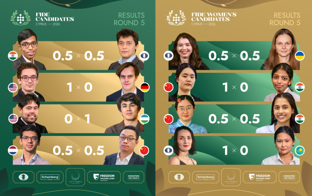 Uzbek Grandmaster Javokhir Sindarov is on a roll leading with 4.5 points after the fifth round in the FIDE Candidates 2026 at the Cap St Georges Hotel and Resort in Pegeia, Cyprus. World Cup Goa winner GM Sindarov defeated World No. 2 Hikaru Nakamura (USA) taking the Candidates field in Cyprus by storm. Former World Championship Challenger GM Fabiano Caruana (USA) kept himself in the race checkmating German GM Matthias Bluebaum, remaining one point behind at 3.5 points. Further one point behind at 2.5 points were GMs Praggnanandhaa Rameshbabu (India) and Anish Giri (Netherlands).
