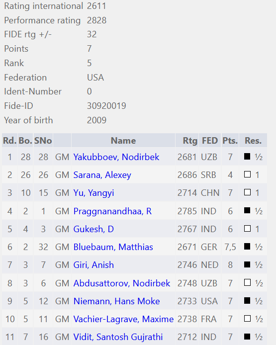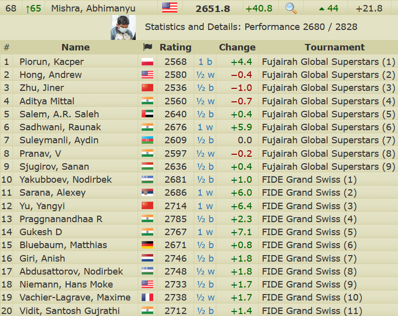 At the 2025 FIDE Grand Swiss in Samarkand, Uzbekistan, 16-year-old American Grandmaster Abhimanyu Mishra extended his remarkable unbeaten streak in classical chess to 67 games, finishing the 11-round tournament with a score of 7/11 and one of the highest performance ratings, above 2800.