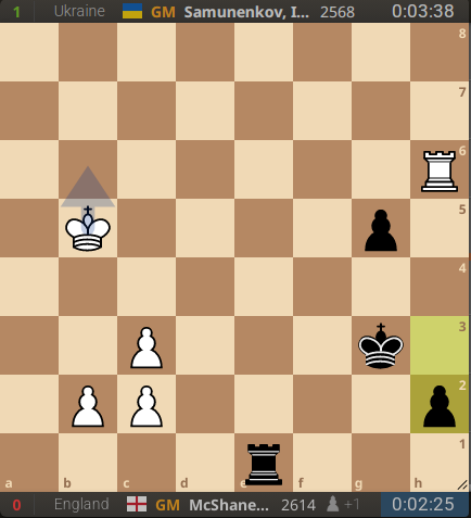 McShane Luke J (2614) – Samunenkov Ihor (2568) 1. e4 e5 2. Nf3 Nf6 3. Nxe5 d6 4. Nf3 Nxe4 5. Nc3 Nxc3 6. dxc3 Be7 7. Be3 O-O 8. Qd2 Nd7 9. O-O-O Nf6 10. Bd3 Re8 11. Rhe1 Bg4 12. h3 Bxf3 13. gxf3 d5 14. h4 Qd6 15. h5 Nxh5 16. Rh1 Nf6 17. Rdg1 Bf8 18. Bf4 Qc6 19. Bg5 g6 20. Bb5 Qxb5 21. Bxf6 Qa6 22. Qf4 h6 23. Kb1 Re6 24. Bd4 Rae8 25. a3 c5 26. Bxc5 Bg7 27. Be3 h5 28. Qb4 Rc8 29. f4 Rc4 30. Qb3 Rf6 31. Rg5 Qc6 32. Rd1 Rd6 33. f5 Bh6 34. Rg3 Bxe3 35. Rxe3 b5 36. fxg6 fxg6 37. Rde1 Rf6 38. Re8+ Kg7 39. R1e7+ Kh6 40. a4 a6 41. axb5 axb5 42. Qa3 Rxf2 43. Rh7+ Kg5 44. Re1 Qf6 45. Rd7 Qf5 46. Qe7+ Kg4 47. Rc1 Re4 48. Qc5 Rf1 49. Rxd5 Rxc1+ 50. Kxc1 Qf4+ 51. Kb1 Re1+ 52. Ka2 Qa4+ 53. Qa3 Qxa3+ 54. Kxa3 h4 55. Rd4+ Kh5 56. Rd8 h3 57. Rh8+ Kg4 58. Kb4 Kg3 59. Rh6 g5 60. Kxb5